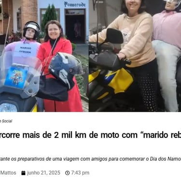 Em uma viagem cheia de significado e superação, a estudante Isabella Jonsson, de 30 anos, percorreu mais de 2 mil quilômetros entre Mundo Novo (MS) e Pomerode (SC) levando um boneco que representa seu marido na garupa da moto. A jornada, repleta de emoção e simbolismo, mostra a força e a criatividade de Isabella ao enfrentar a estrada com uma companhia inusitada.